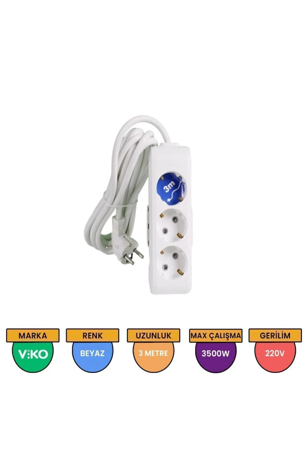 Viko 3lü Topraklı Kablolu Ç.K 3mt Priz, Beyaz
